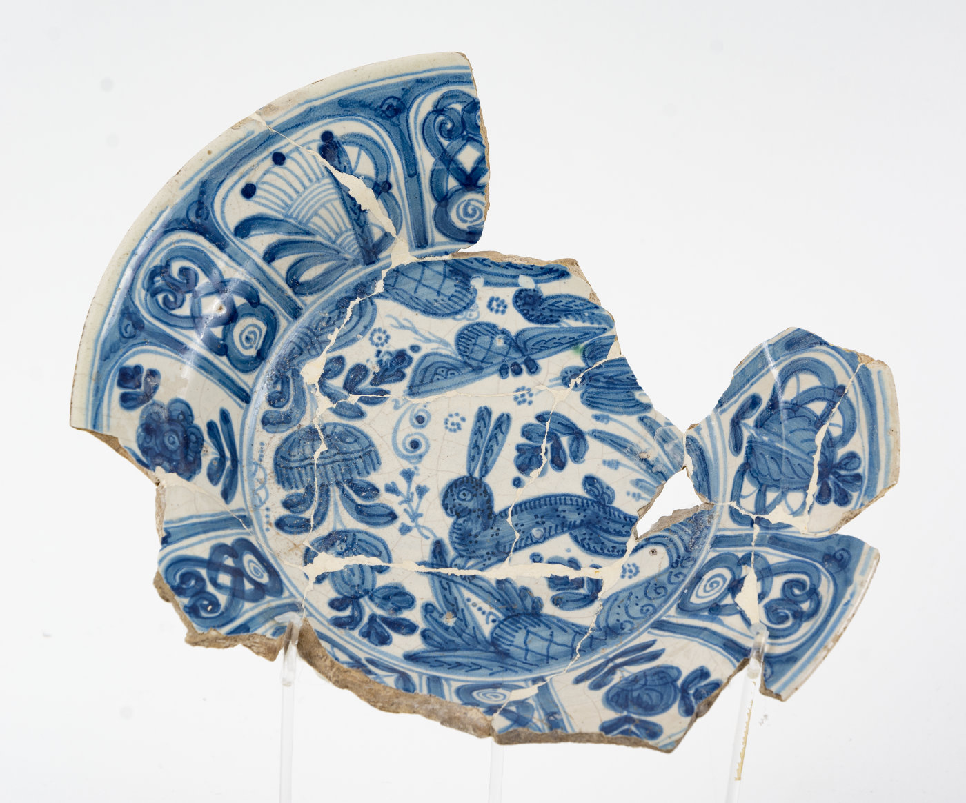 The letter “F” is another important mark found on vessels and a series of tiles representing different trades (see fig. 13). These tiles are among the most finely painted works produced in Puebla during the seventeenth century. Not all the tiles from the series have the “F” mark, although the frequency of the mark and the repetition of the scenes suggest that these were produced at the same workshop. There are a number of artists from the last quarter of the seventeenth century whose names contain the letter “F,” such as Juan de la Feria, Luis Fernández Lechuga, and Miguel Fernández Palomino. While the decoration of the tiles is entirely unique, they resemble the style of decoration found in Kraak porcelain from the Ming dynasty (1368–1644)—a style that became increasingly popular among Puebla workshops by the turn of the eighteenth century. An excellent example of this type of design was uncovered from a site excavated during the renovation of the Franz Mayer Museum in Mexico City (fig. 16).